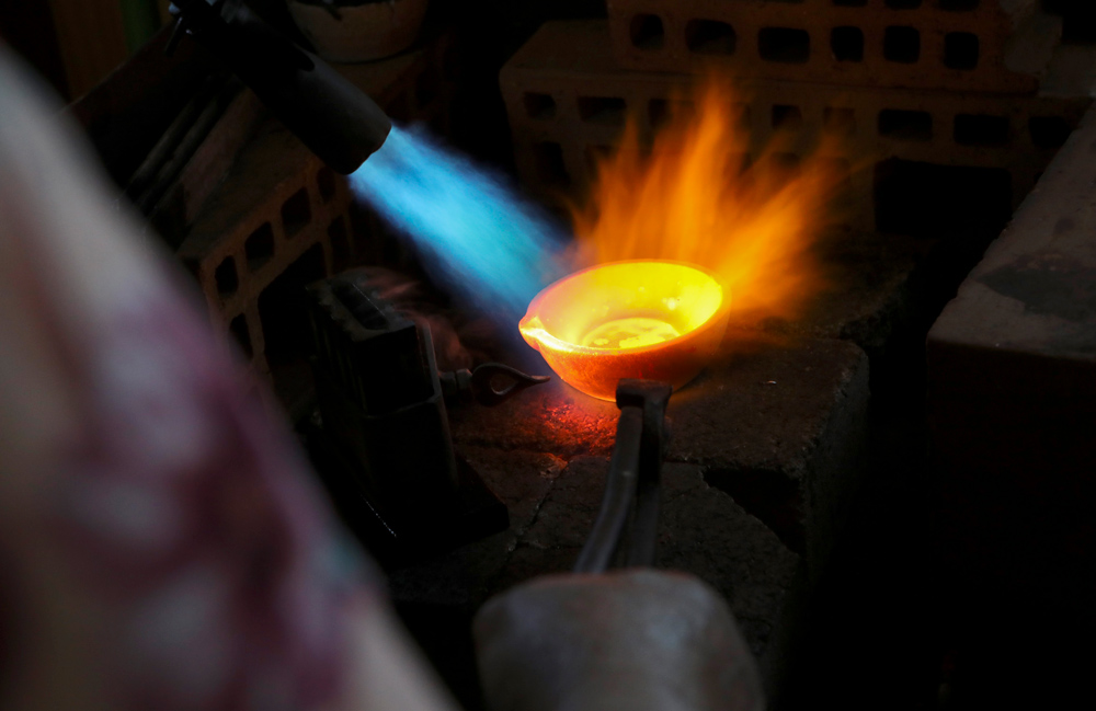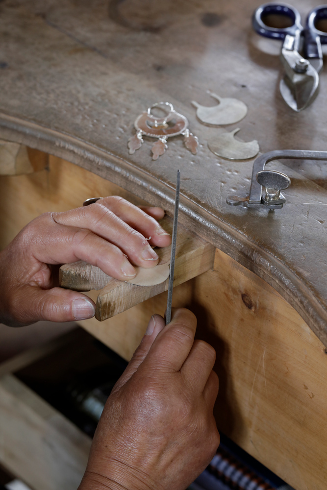 Para crear cada pieza, las artesanas se surten de plata en granalla: bolitas del tamau00f1o de un grano de arroz, que mezclan con cobre y exponen a temperaturas altas y controladas, hasta fundirlas y convertirlas en lu00e1minas.